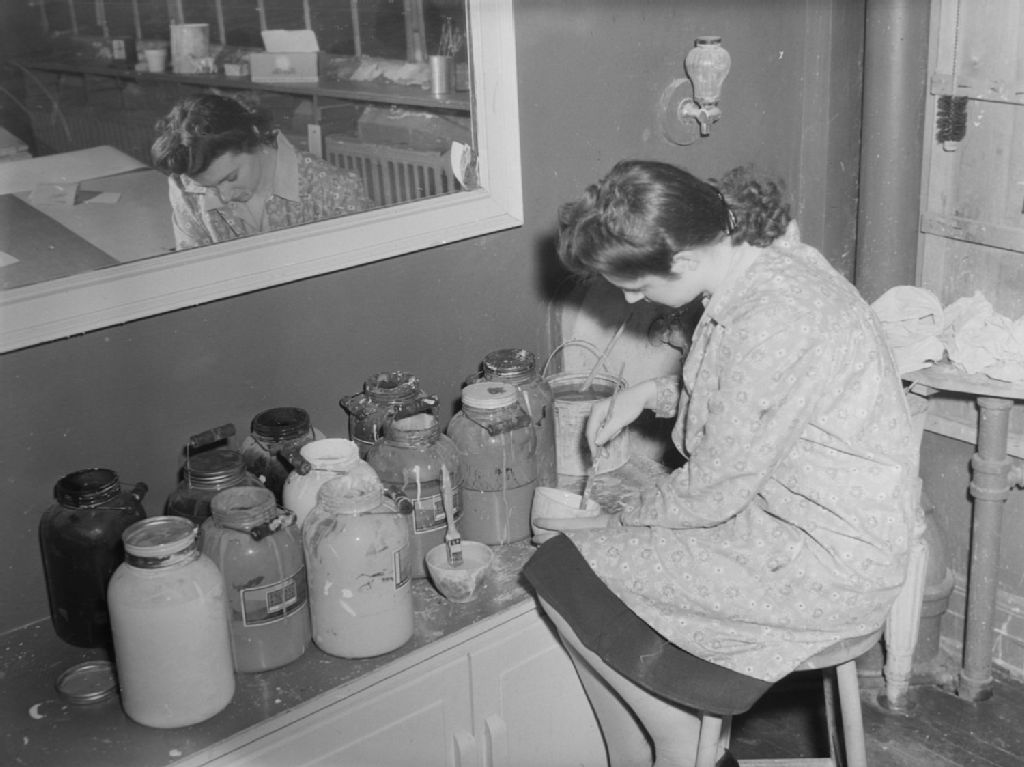 Hélène Saurette, décoratrice de vitrines de magasins, mélange des produits dans un mortier. Elle est assise à une table sur laquelle se trouvent plusieurs bocaux