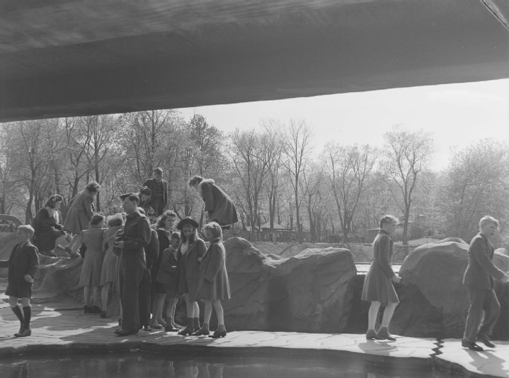 Des enfants grimpent sur des rochers au parc Lafontaine à Montréal. Nous remarquons, près d'eux, un militaire en uniforme tenant un appareil photographique