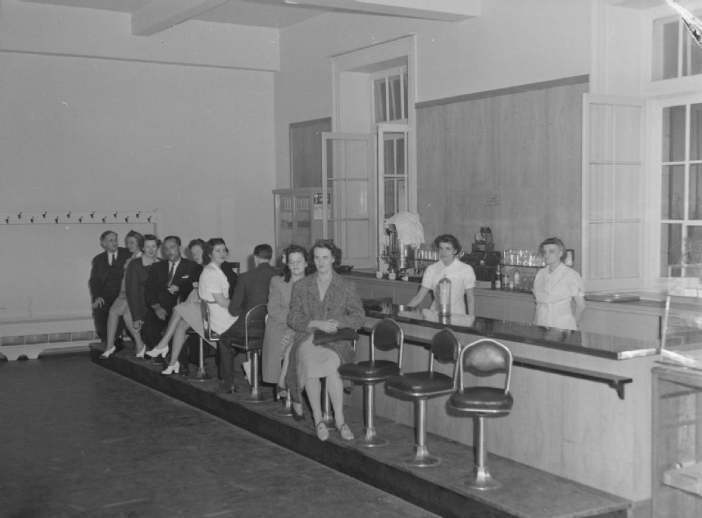 Des clients sont assis sur des tabourets devant un long comptoir derrière lequel se trouvent deux serveuses à la Palestre nationale située rue Cherrier à Montréal