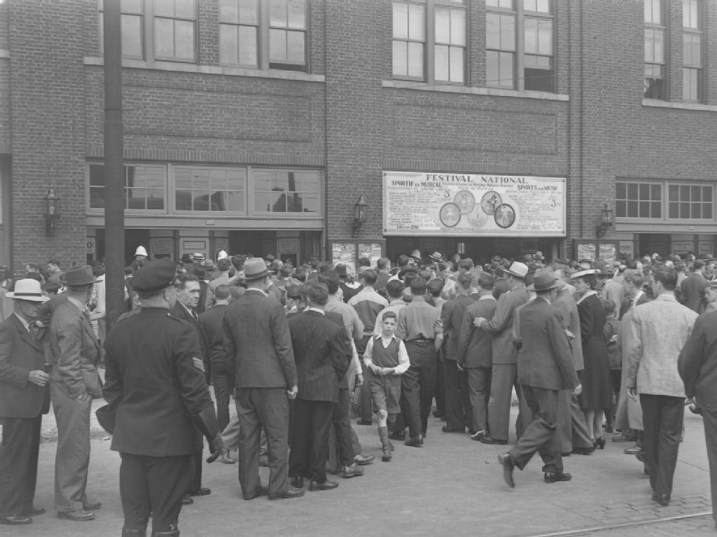 Nous voyons des files d'attente d'amateurs de matchs de base-ball disputés au Stadium de la rue Ontario Est à Montréal. Un panneau annonce le Festival national sportif et musical qui va être présenté au stade en juillet