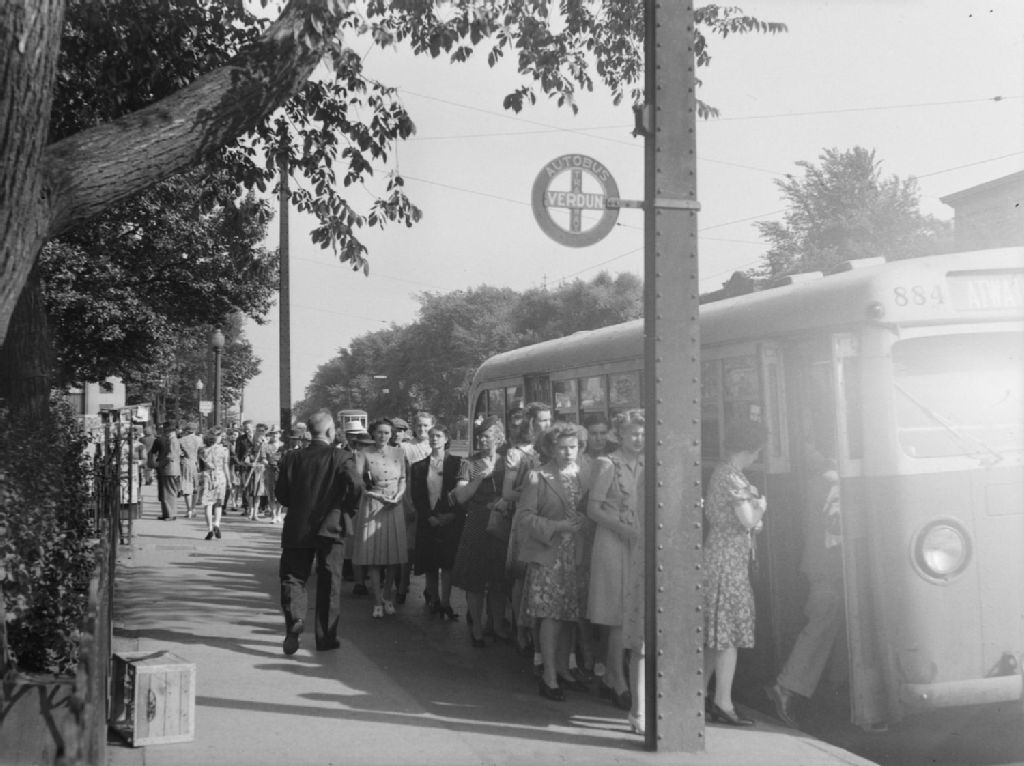 Nous voyons une file d'attente de voyageurs de l'autobus 884 Atwater à l'intersection de la rue Sainte-Catherine Ouest et de l'avenue Atwater à Montréal
