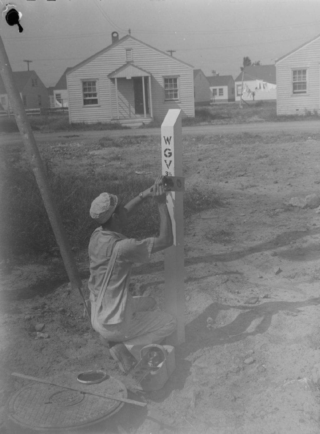 Un ouvrier modifie l'adresse d'une maison du village de 400 maisons destinées aux familles des ouvriers employés aux usines de guerre de «Noorduyn Aviation Ltd» situées chemin Bois-Franc à ville Saint-Laurent