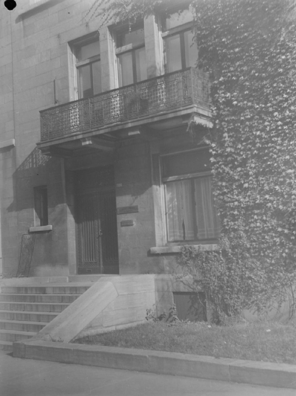 Nous voyons la façade d'une résidence sur laquelle deux plaques identifient Les Concerts symphoniques de Montréal et le docteur W. J. Lafave. Cette maison au balcon en fer forgé est située au 1504, rue Sherbrooke Ouest à Montréal