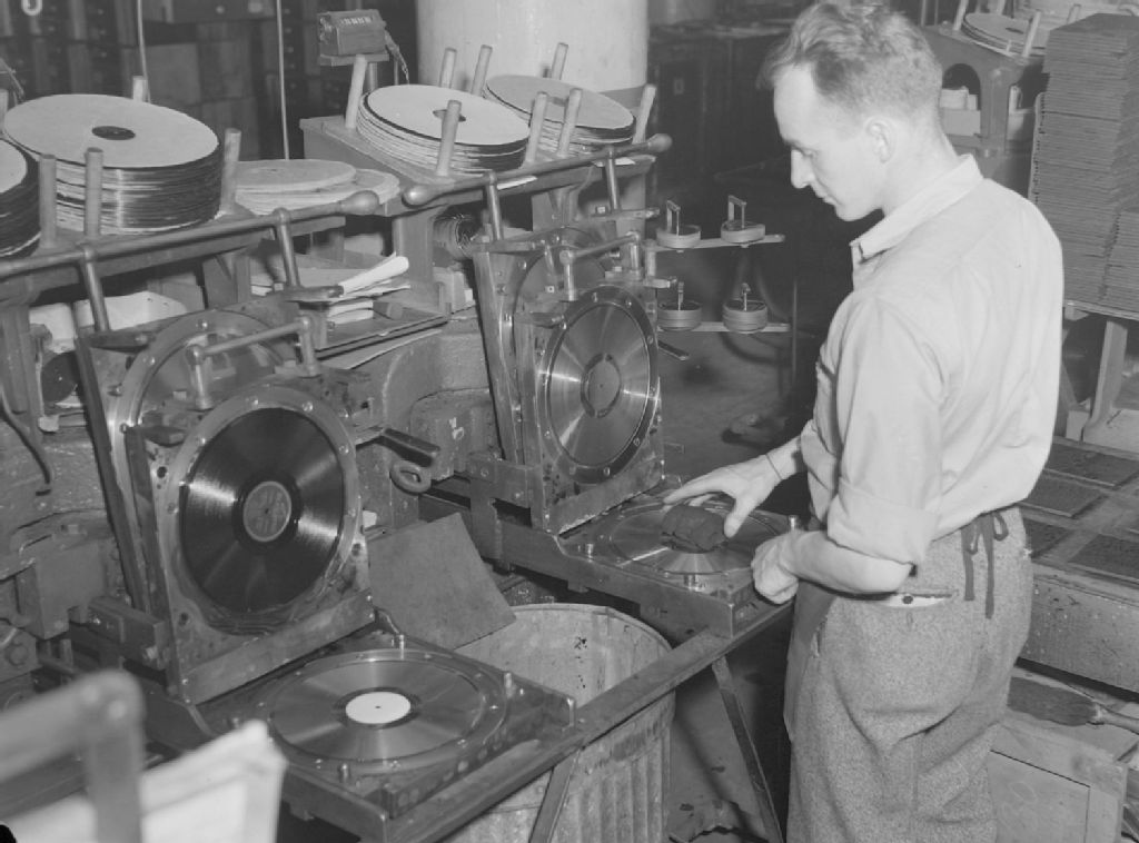 Un employé de RCA Victor, situé rue Lacasse à Montréal, fait imprimer les disques dans des presses