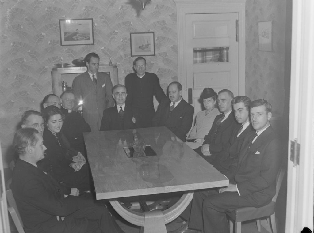 Plusieurs personnes sont réunies autour de la table de la salle à manger de la résidence de l'écrivain Victor Barbeau qui habite au 109, chemin de la Côte-Saint-Antoine à Westmount