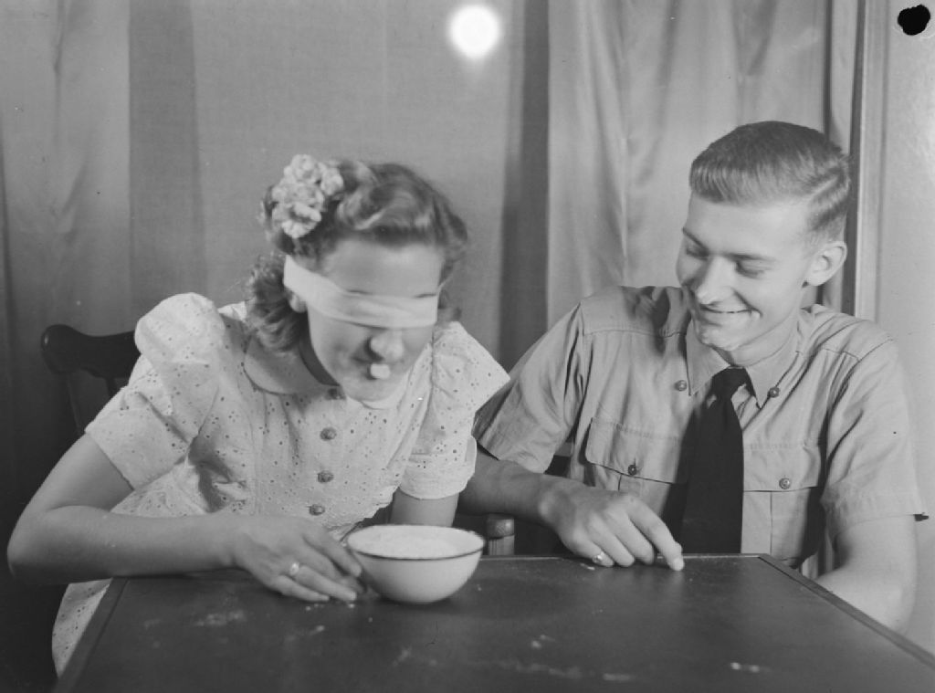 À une partie d'halloween, une jeune fille aux yeux bandés serre entre les lèvres une pièce d'un sou au-dessus d'un bol rempli de farine. Un ami, assis à ses côtés, l'observe