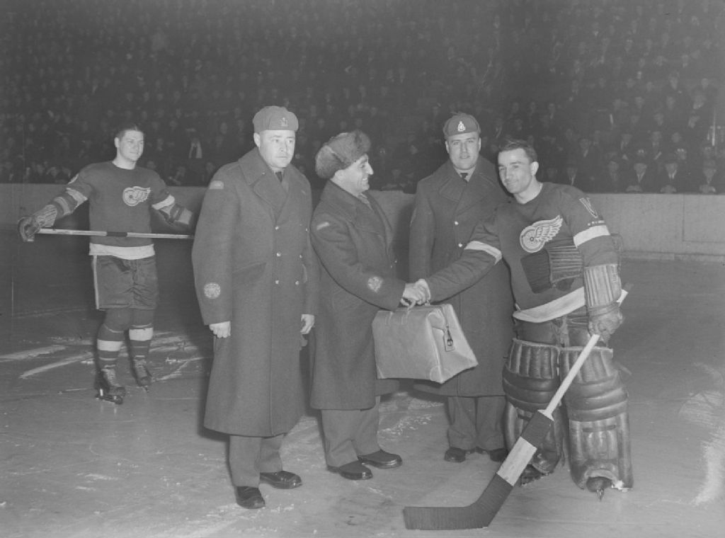 F. Clancy d'Ottawa, un de ses compagnons d'armes, remet une valise à Connie Dion, gardien de but des Red Wings de Détroit. Deux autres militaires et un joueur des Red Wings sont aussi sur la glace. Cette présentation est faite lors d'un match de hockey opposant le Canadien de Montréal aux Red Wings de Détroit