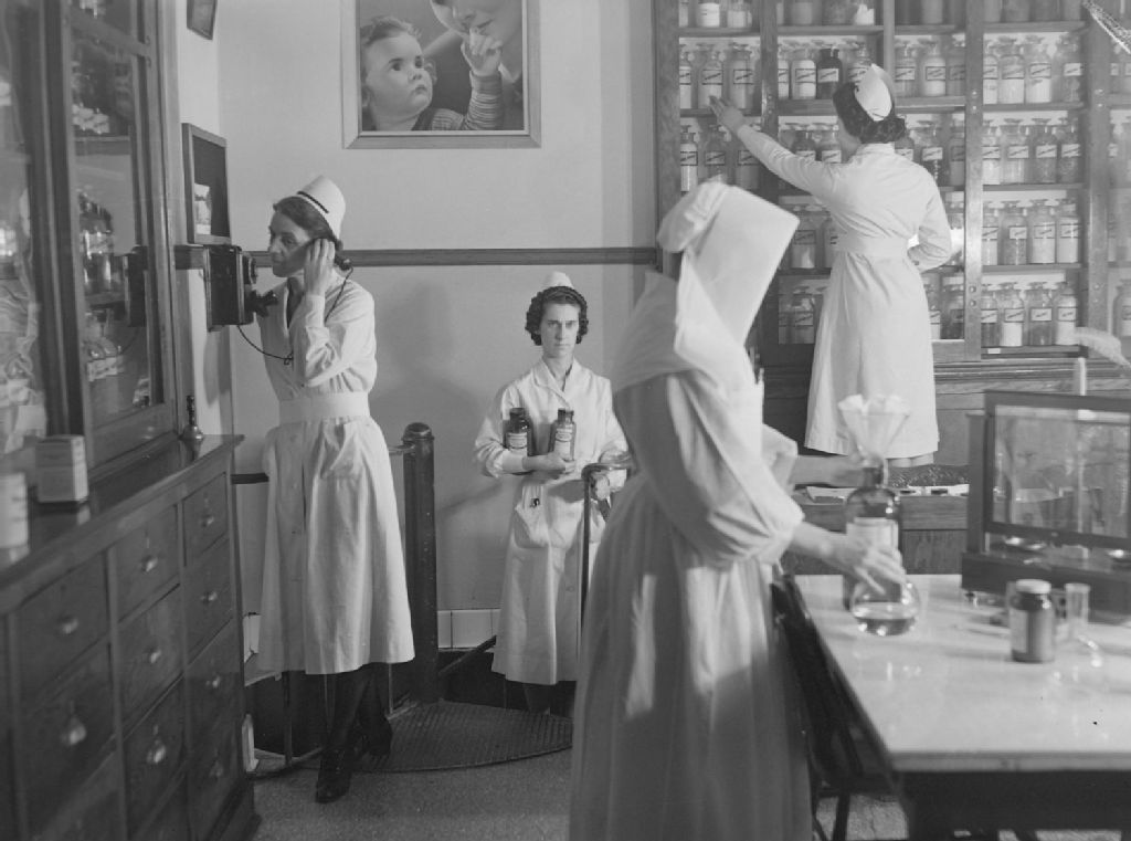 Nous voyons des infirmières, dont une religieuse des Filles de la Sagesse dans la pharmacie de l'hôpital Sainte-Justine à Montréal. Une infirmière parle dans un téléphone mural