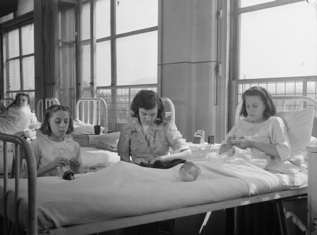 Trois jeunes patientes font des travaux d'aiguille dans un dortoir de l'hôpital Sainte-Justine à Montréal
