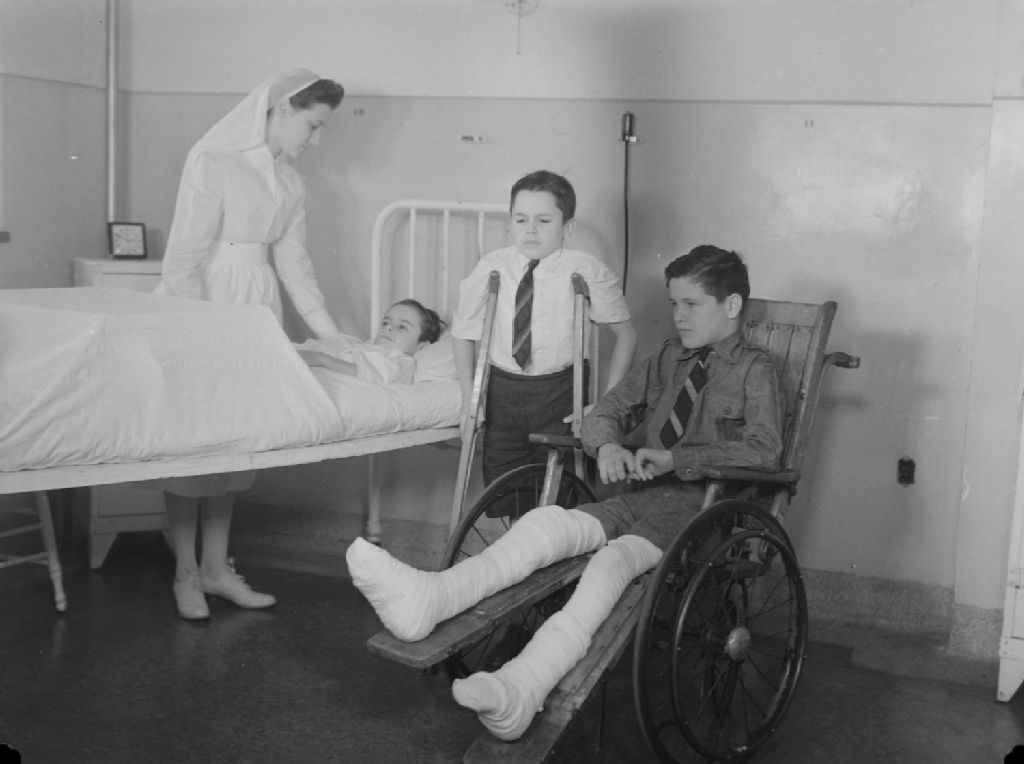 Nous voyons un patient en fauteuil roulant, un patient appuyé sur des béquilles et un autre patient alité. Ils sont, avec une infirmière, dans une chambre de l'hôpital Sainte-Justine à Montréal
