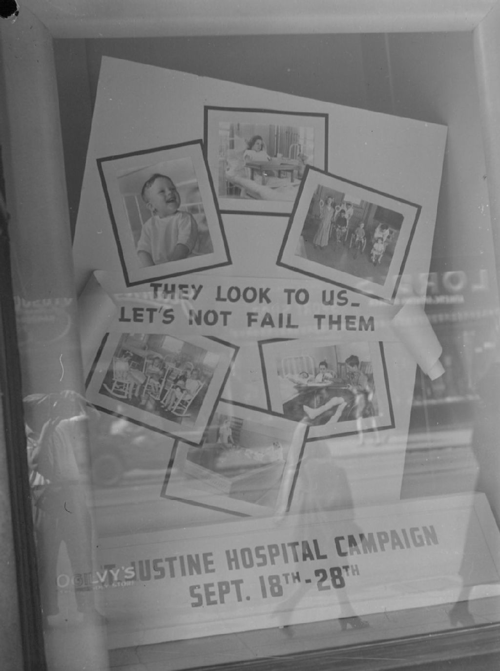 Nous voyons une affiche de la campagne de souscription de l'hôpital Sainte-Justine. Illustrée de photos de Conrad Poirier, cette affiche est dans la vitrine du magasin «Ogilvy's» situé au 1307, rue Sainte-Catherine Ouest à Montréal