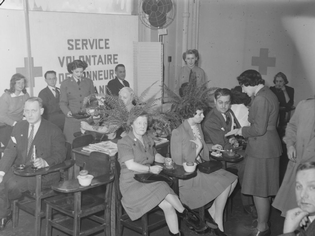 Après avoir donné du sang à la Croix-Rouge, des donneurs se reposent. Des membres de la «Junior League» leur servent une boisson gazeuse ou une boisson chaude. Ils sont à la «Phillips Aircraft School» située au 1626, rue Sainte-Catherine Ouest à Montréal