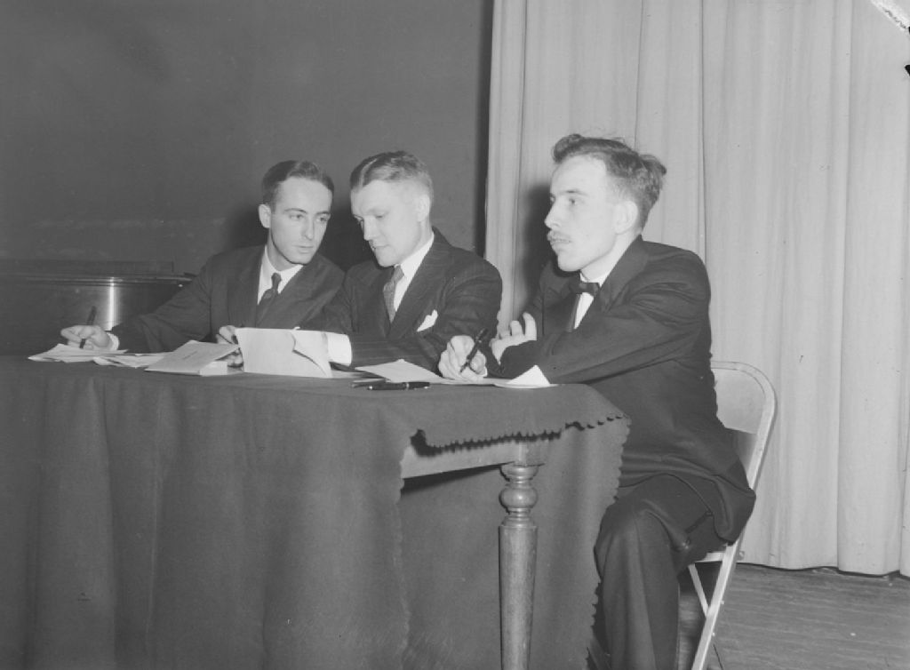 Nous voyons trois membres de la Chambre de commerce du district de Montréal: Ernest Beauchemin, Roland Pouliot et Gabriel Marchand. Ils participent au débat présenté à la salle de l'Ermitage du Collège de Montréal
