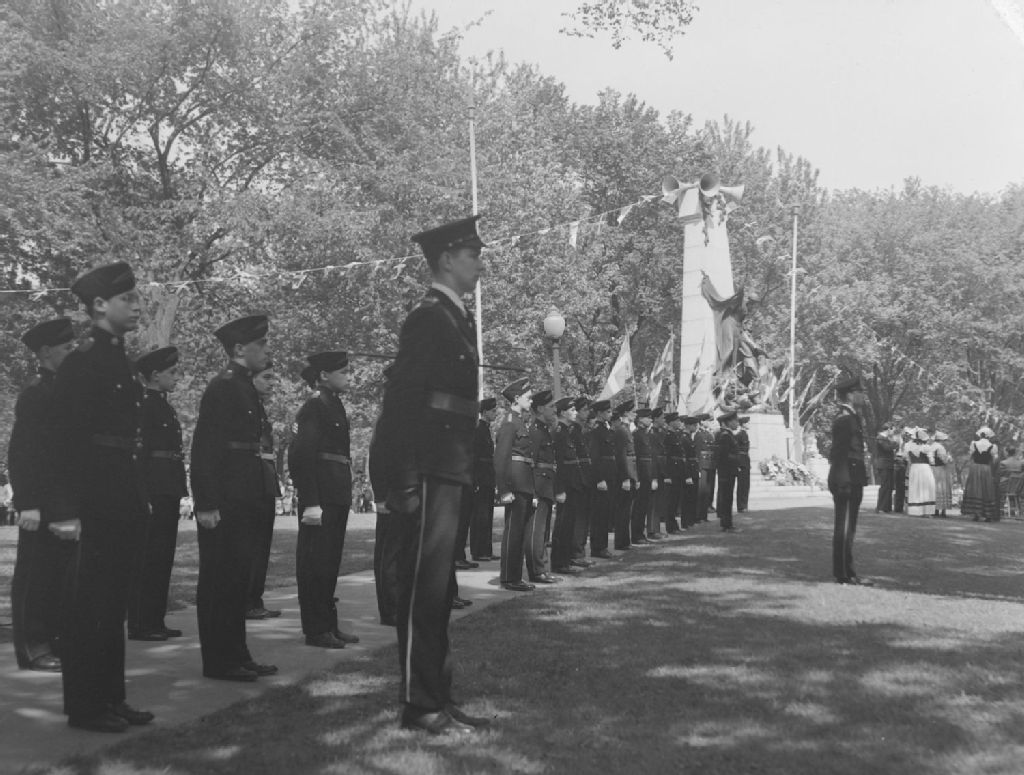 Nous voyons un régiment de militaires au garde-à-vous près du monument à Dollard des Ormeaux au parc Lafontaine à Montréal. Ce monument est l'oeuvre du sculpteur Alfred Laliberté