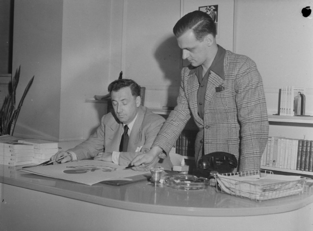 Lucien Parizeau, président de la maison d'édition «Parizeau Lucien & Cie Ltée» du square Phillips à Montréal, est assis à son bureau et regarde une peinture avec un collègue