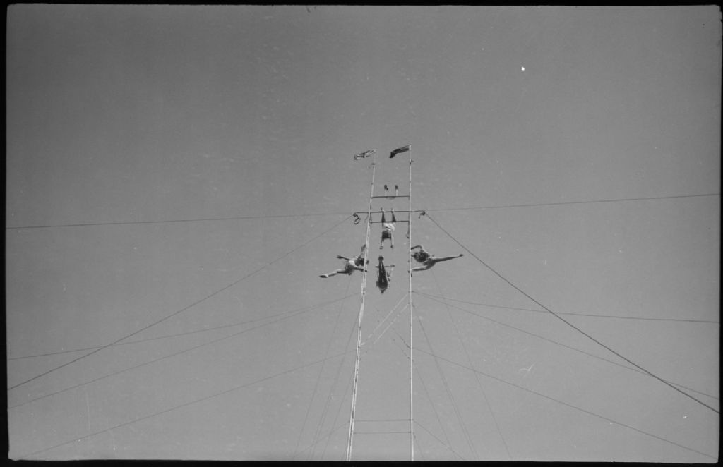 Nous apercevons quatre trapézistes en pleine voltige au parc Belmont à Cartierville. Le spectacle a lieu à l'extérieur