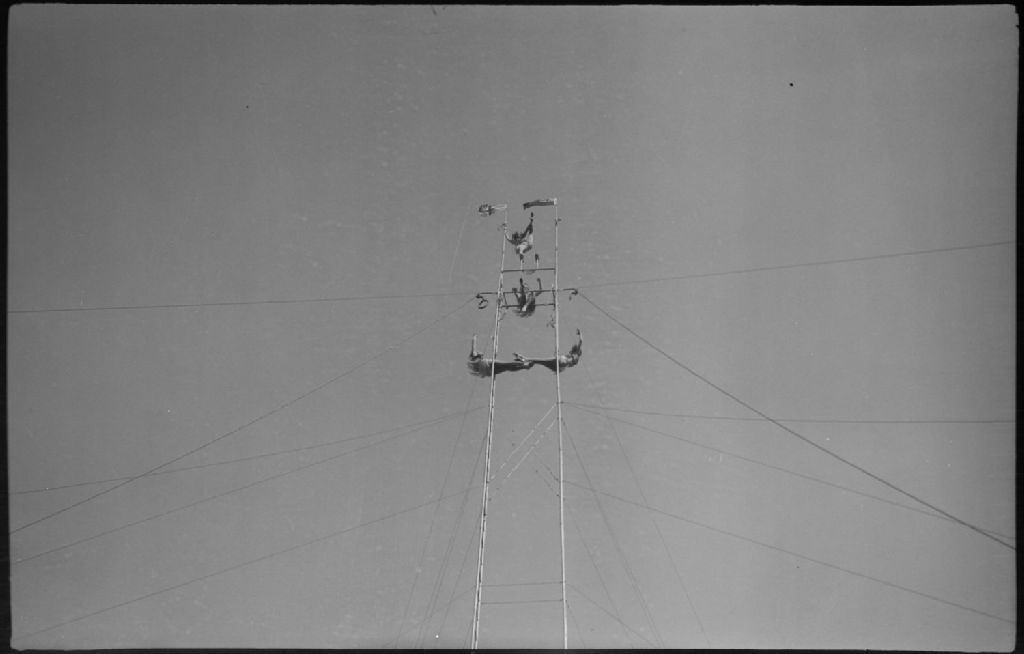 Nous observons quatre trapézistes exécutant des exercices de haute voltige en plein air au parc Belmont à Cartierville