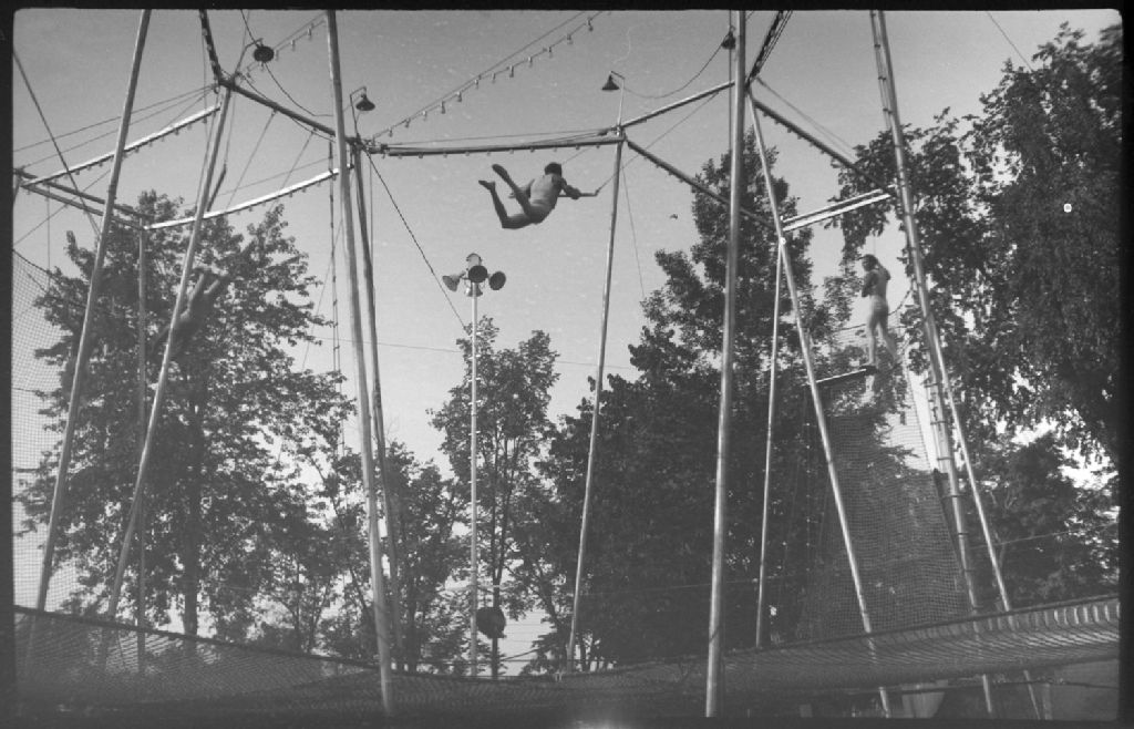 Nous apercevons un trapéziste se laissant tomber dans un filet lors d'un spectacle en plein air au parc Belmont à Cartierville. Nous pouvons voir la structure complète du trapèze ainsi que le filet de sécurité