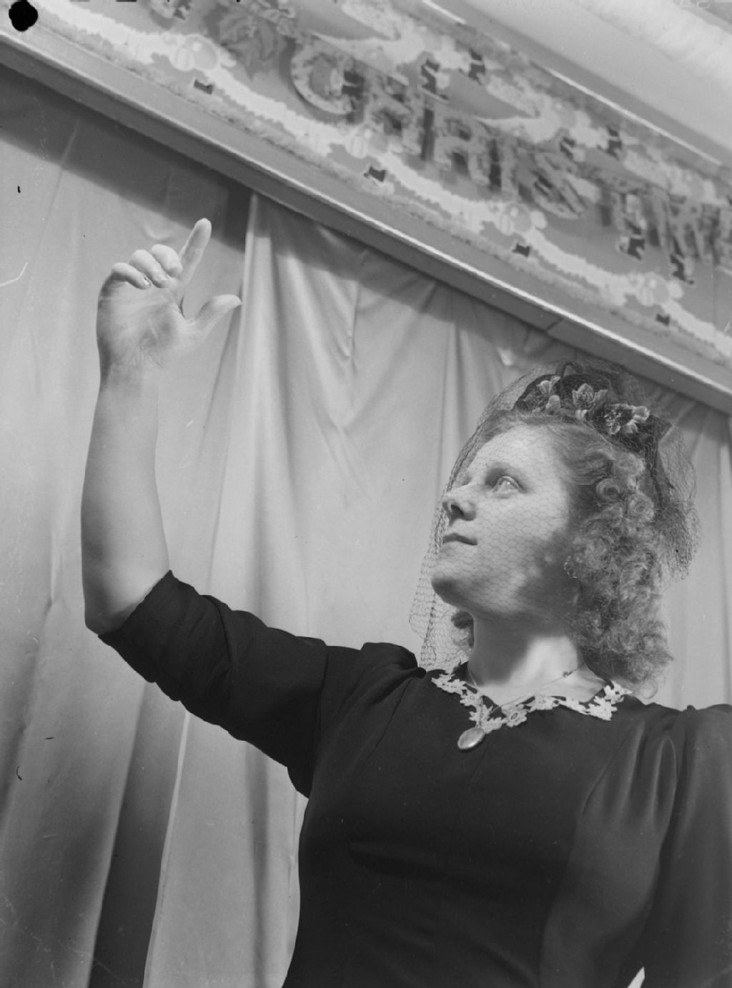 Nous voyons Fernande Lambert, le visage couvert de la voilette de son petit chapeau à fleurs. Elle se tient sous une banderole portant l'inscription «Christmas»