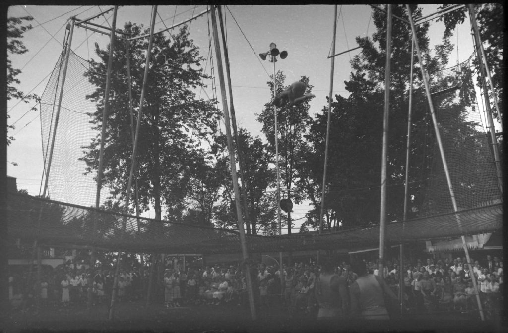 Nous voyons un trapéziste exécutant une figure lors d'un spectacle en plein air au parc Belmont à Cartierville. Nous remarquons le filet de sécurité au bas de l'image