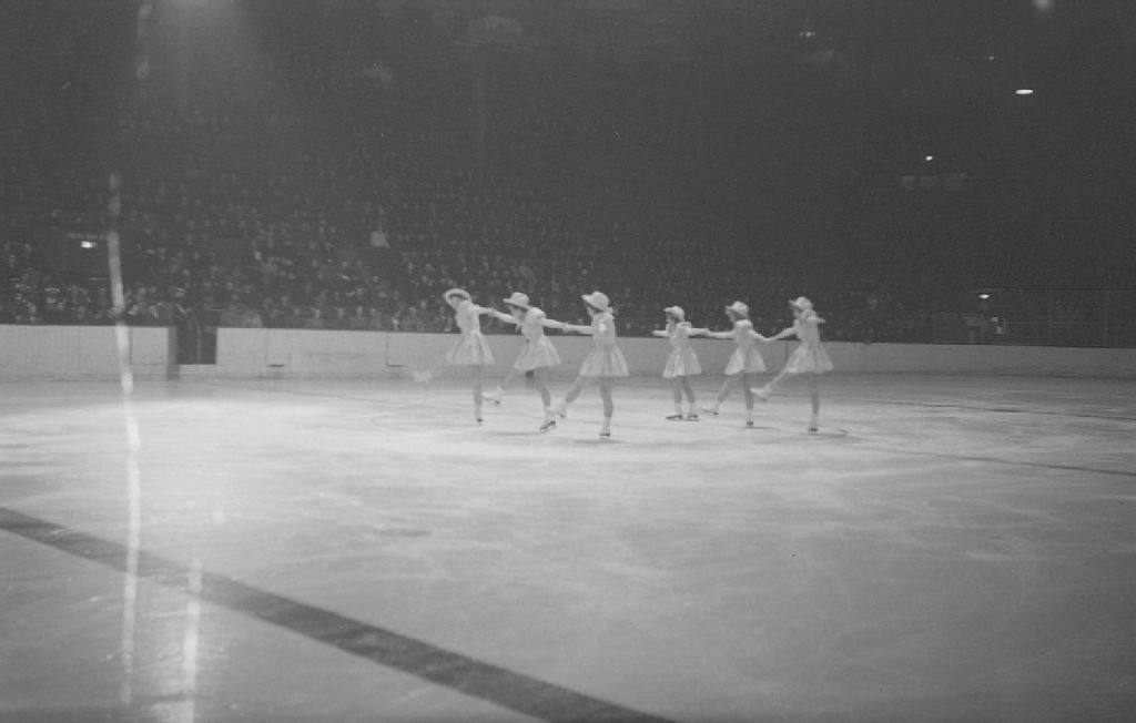 Nous voyons six patineuses artistiques, les Farmerettes, en spectacle sur la glace du Forum de Montréal