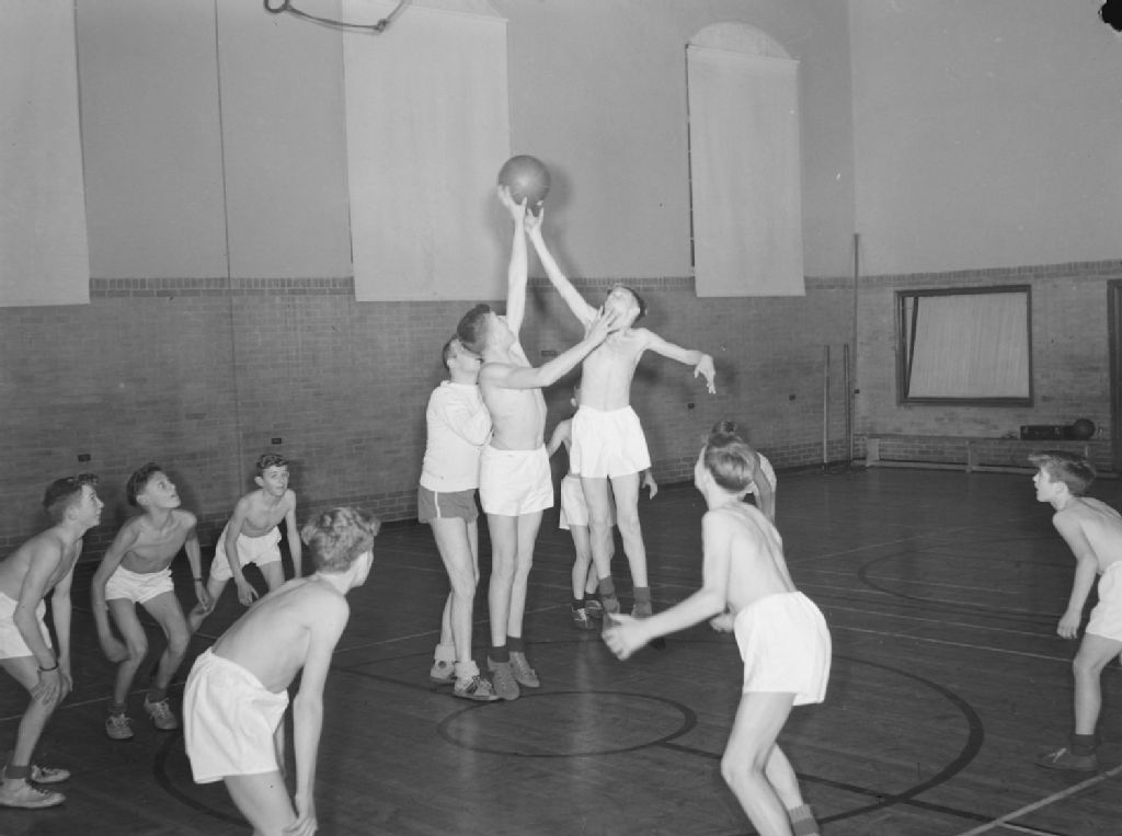 Deux équipes de garçons jouent au basket-ball dans le gymnase de la Young Men's Christian Association de Verdun