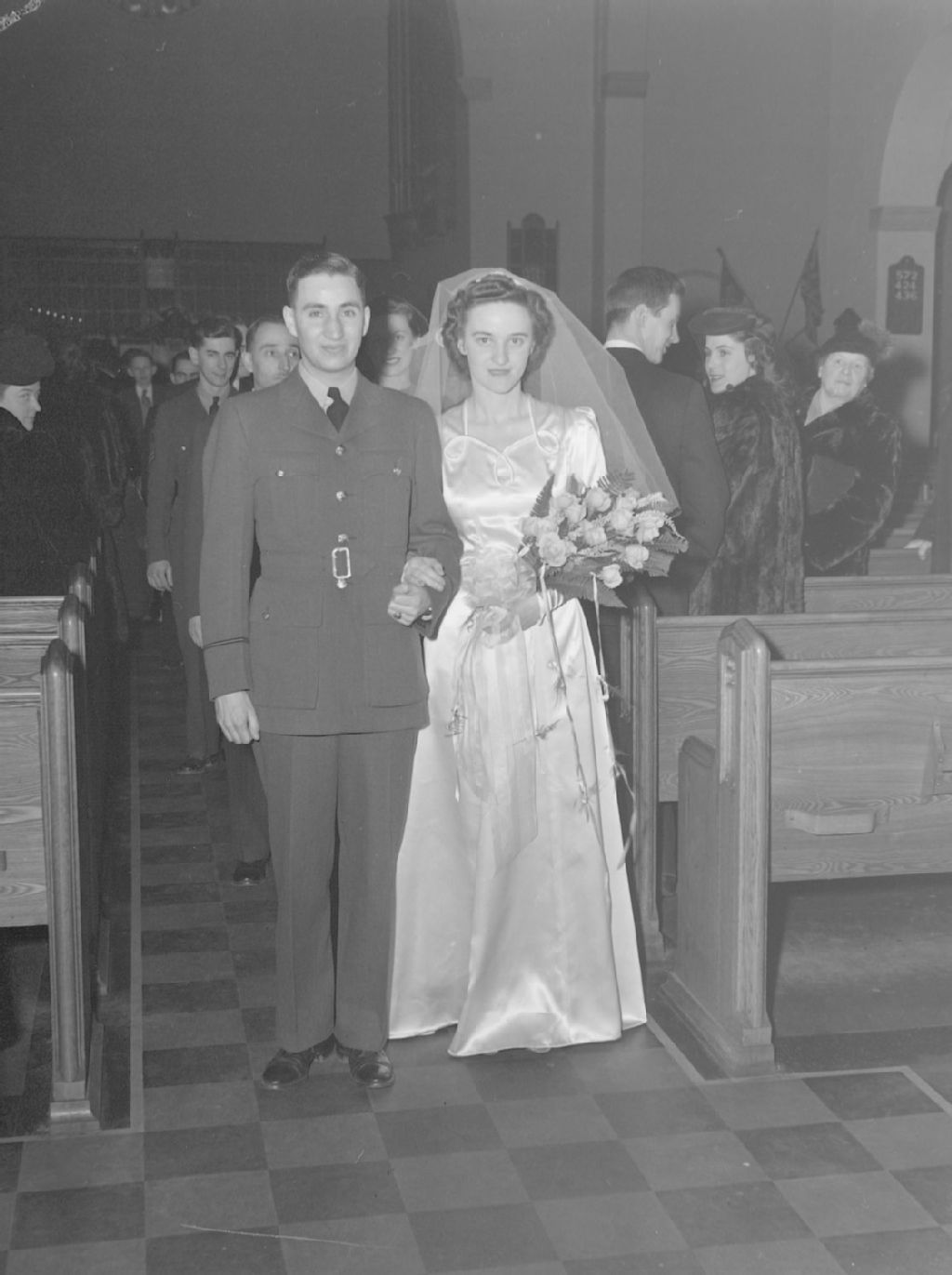 Les nouveaux mariés Enid Wilson Sprott et Allan Cameron Findlay, ce dernier en uniforme militaire, marchent dans la nef centrale de l'église après la célébration de leur mariage