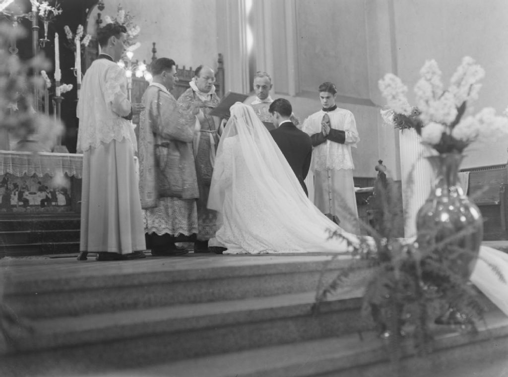 Les comédiens Janine Sutto et Pierre Dagenais sont à genoux devant l'abbé Robert Llewellyn qui célèbre leur mariage dans l'église Saint-Louis de France (Montréal)