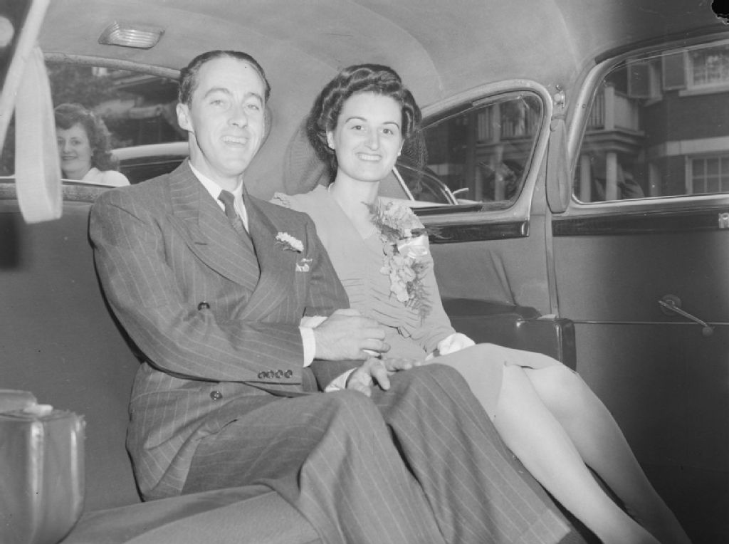 Les nouveaux mariés Madame Valois et Marcel Dufresne, agent de publicité du club de baseball de Montréal, sont assis sur la banquette arrière d'une voiture