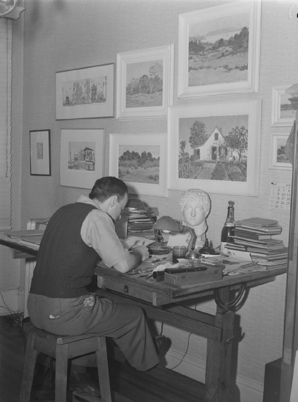 Nous voyons l'artiste peintre Jean-Charles Faucher assis à une table à dessin dans son appartement de la rue Sainte-Famille à Montréal. Nous remarquons plusieurs de ses huiles accrochées au mur