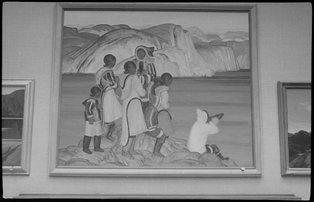 Nous voyons la reproduction d'une oeuvre peinte portant le numéro 14 et exposée à la galerie de l'« Art Association » de Montréal, située au 1379 de la rue Sherbrooke Ouest. L'oeuvre représente un groupe de femmes et d'enfants inuits en costume traditionnel sur le bord d'un cours d'eau. Un enfant pointe une lunette d'approche vers l'horizon