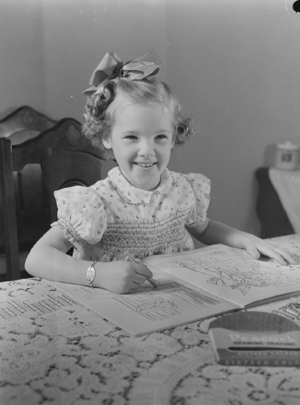 La petite Deanna Luck colore un dessin dans un album à colorier avec des crayons de couleurs Peacock