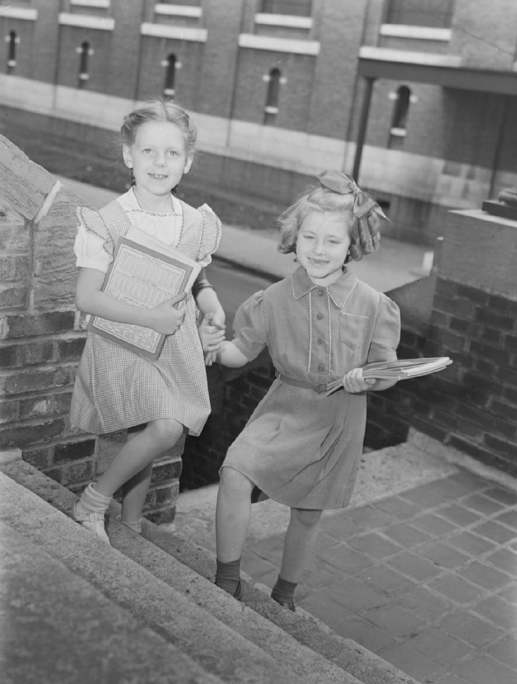 Jeannette Souci et Pierrette Lambert, cahiers sous le bras, montent les marches extérieures de l'école. Elles se tiennent par la main