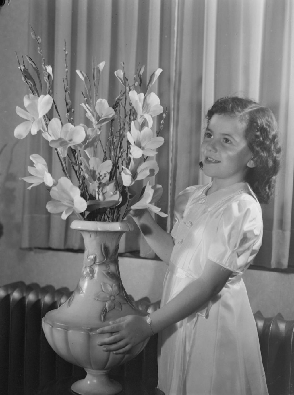 La petite Renée Saint-Jean se tient à côté d'un vase de fleurs