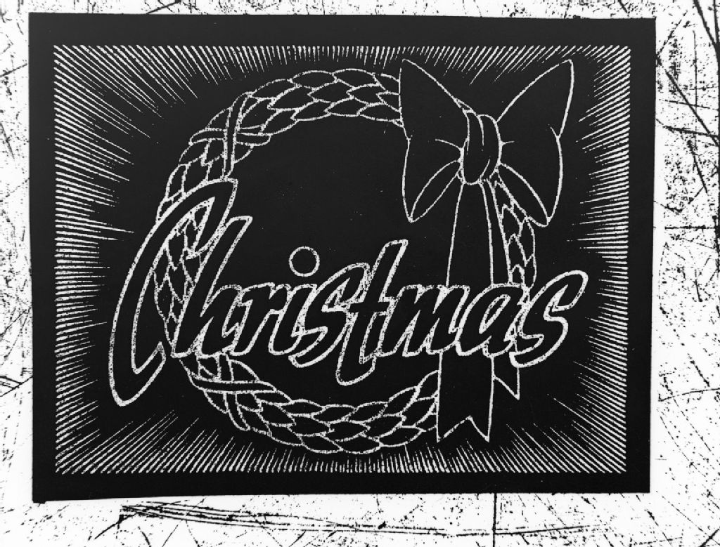 Nous voyons un projet de carte de Noël représentant le dessin d'une couronne de Noël et le mot Christmas