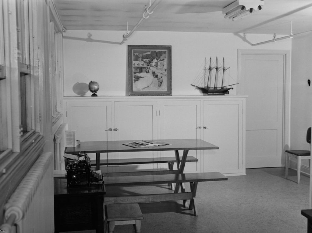 Nous voyons l'intérieur d'un bureau du journal Le Samedi situé rue de Bullion à Montréal. Nous remarquons une machine à écrire et la maquette d'un trois-mâts