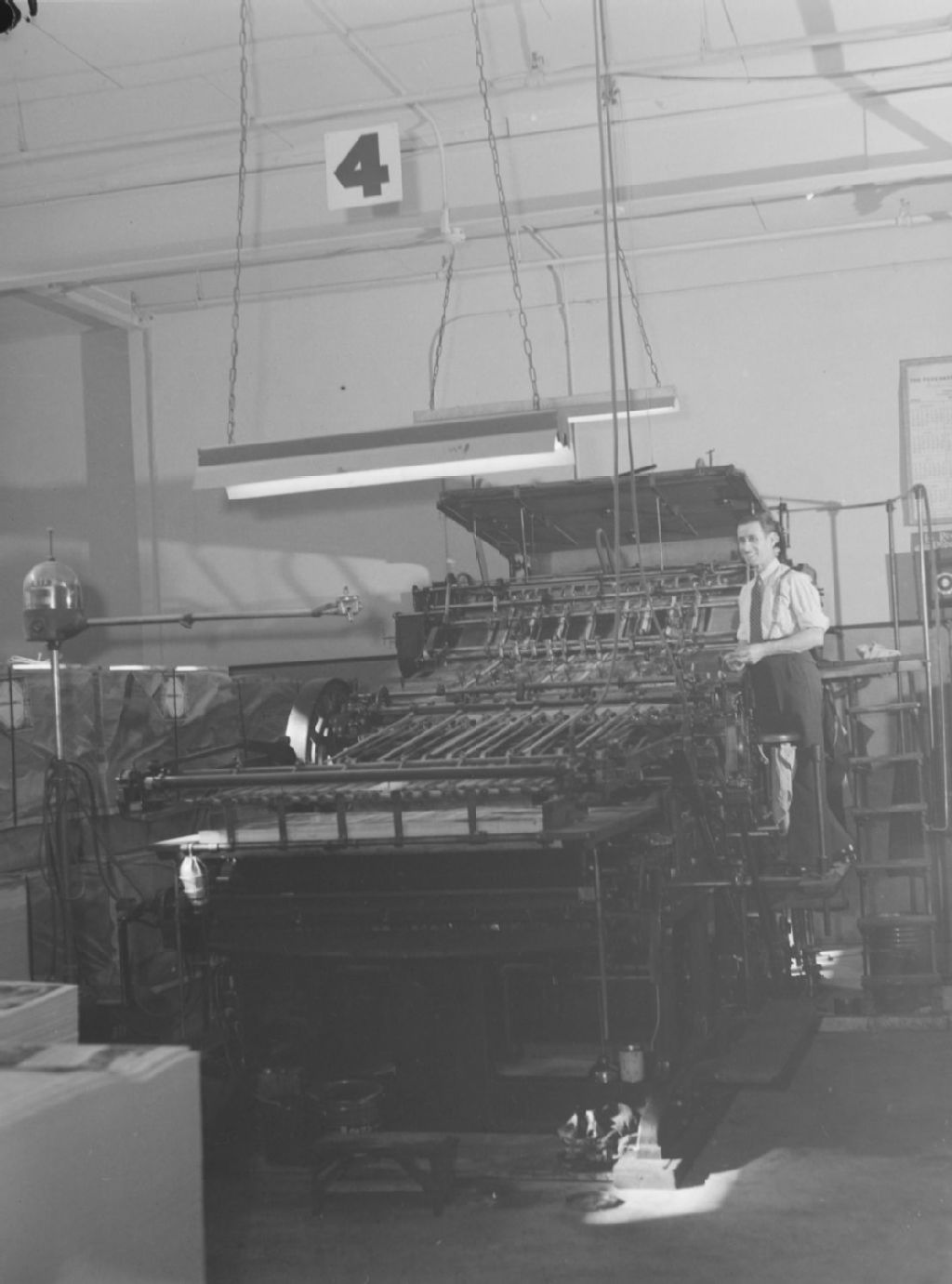 Nous voyons un employé travaillant aux presses du journal Le Samedi situé rue de Bullion à Montréal