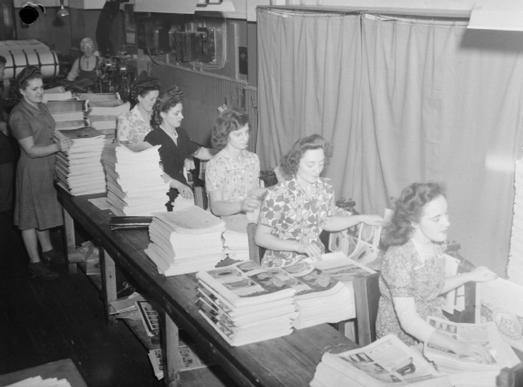 Des jeunes femmes insèrent des pages, plient et empilent des journaux au journal Le Samedi situé rue de Bullion à Montréal