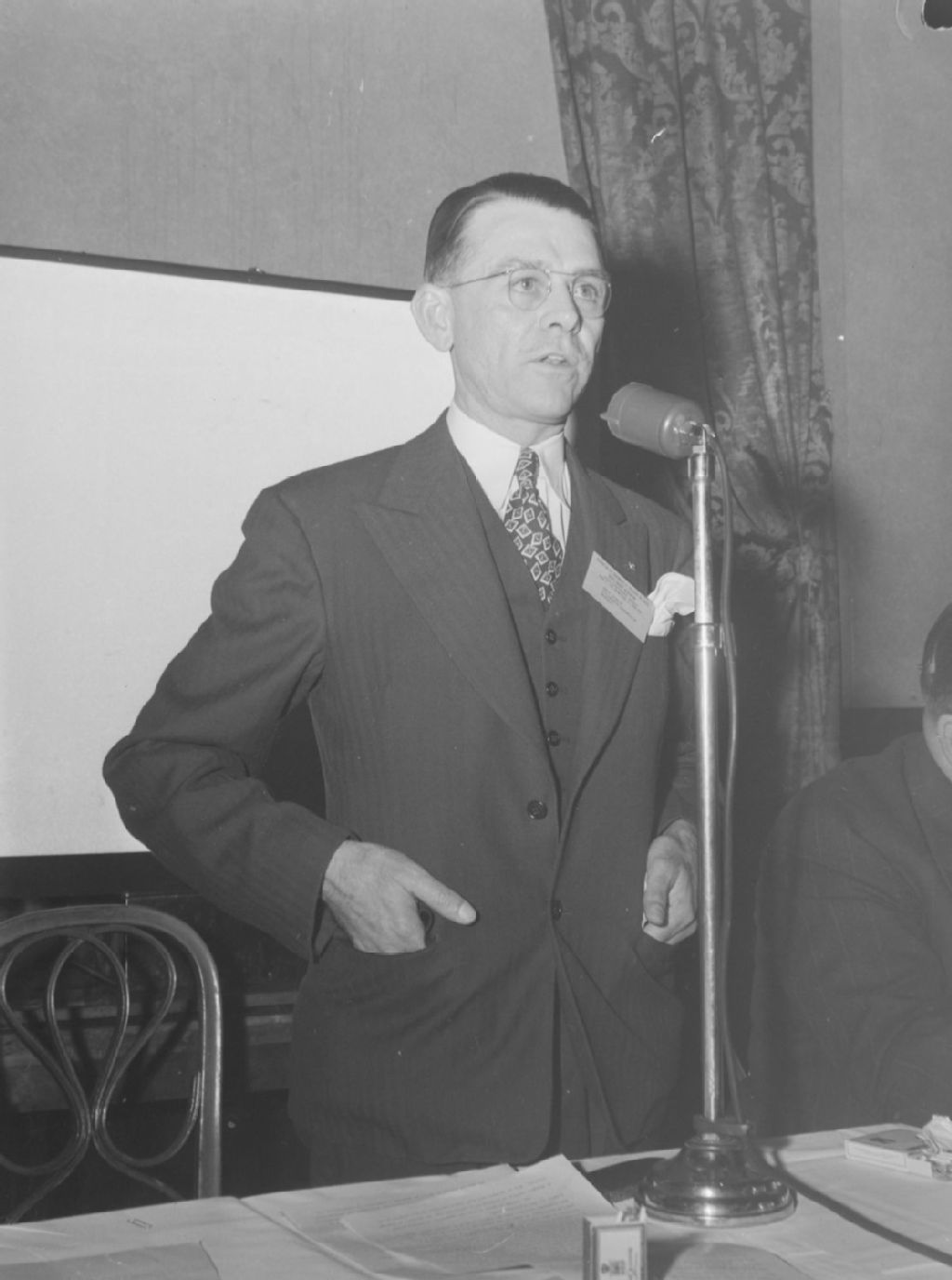 Henri Cuirot, gérant de la Boulangerie provinciale de la rue Saint-Urbain à Montréal, parle au microphone à la conférence annuelle de l'Association des boulangers et pâtissiers du Québec présentée à Montréal