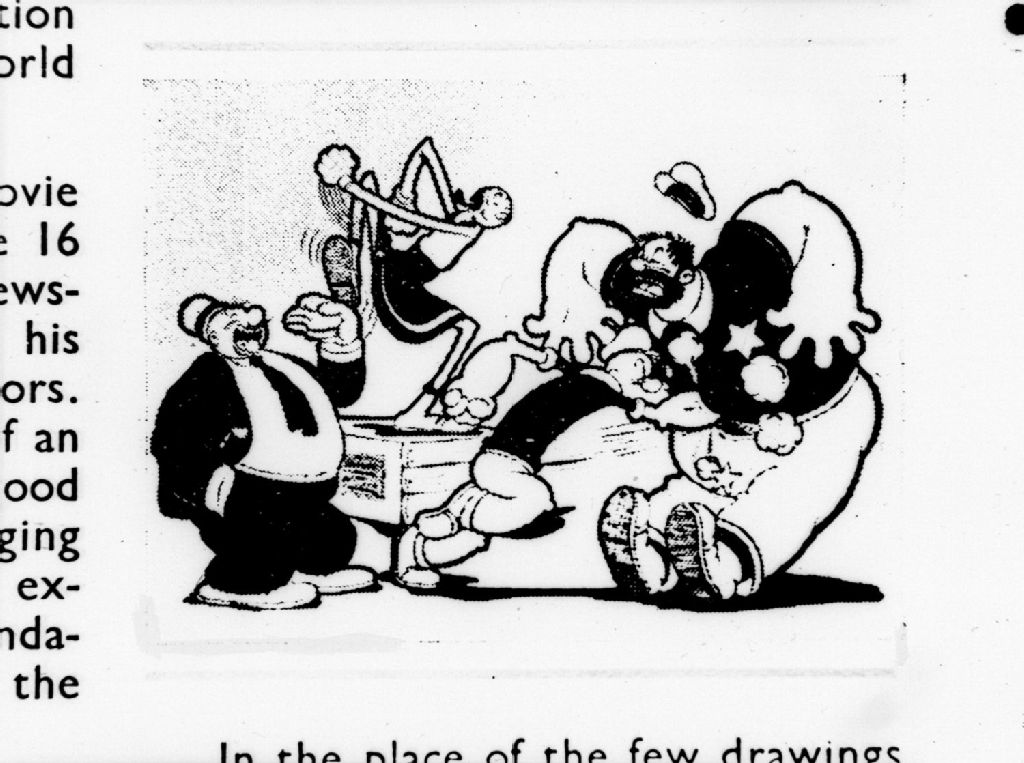Nous voyons une photographie d'un dessin des personnages d'animation Popeye le marin, Olive, Brutus et Glouton. Ce dessin accompagne un texte publié dans le mensuel Pathéscope lors de la sortie du film «Blow me Down»