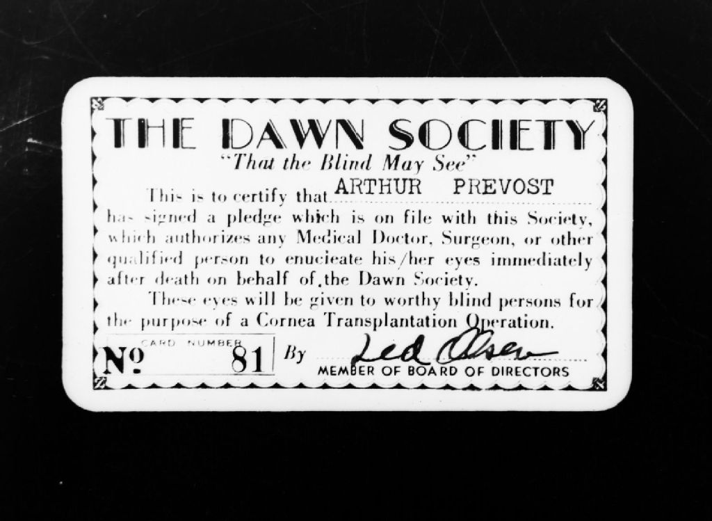 Nous voyons la carte de donneur émise par «The Dawn Society» à Arthur Prévost. Celui-ci permet le prélèvement de ses yeux après sa mort en vue d'une transplantation de la cornée