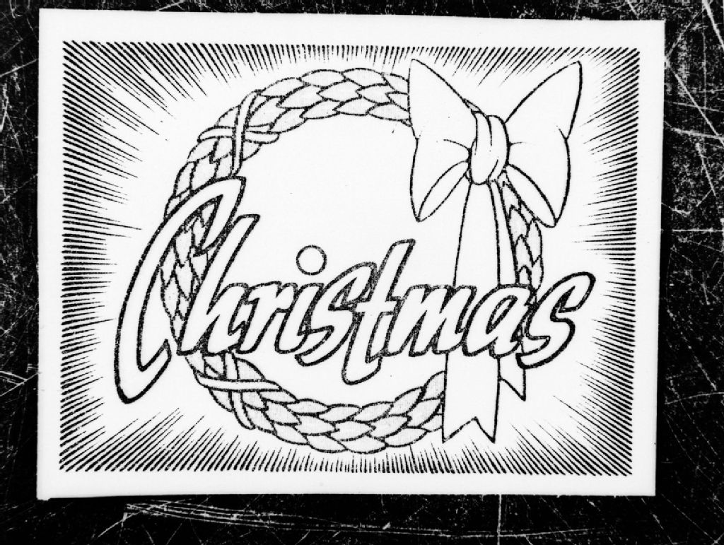 Nous voyons un projet de carte de Noël représentant le dessin d'une couronne de Noël et le mot Christmas