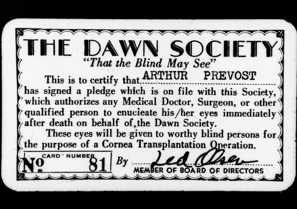 Nous voyons la carte de donneur émise par «The Dawn Society» à Arthur Prévost. Celui-ci permet le prélèvement de ses yeux après sa mort en vue d'une transplantation de la cornée