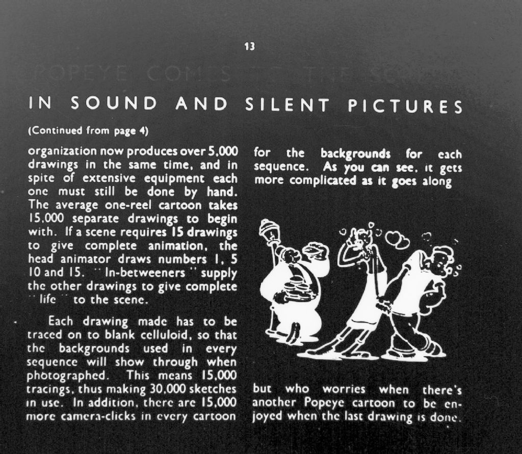 Nous voyons une photographie d'un dessin des personnages d'animation Popeye le marin, Olive et Glouton. Ce dessin accompagne un texte publié dans le mensuel Pathéscope lors de la sortie du film «Blow me Down»