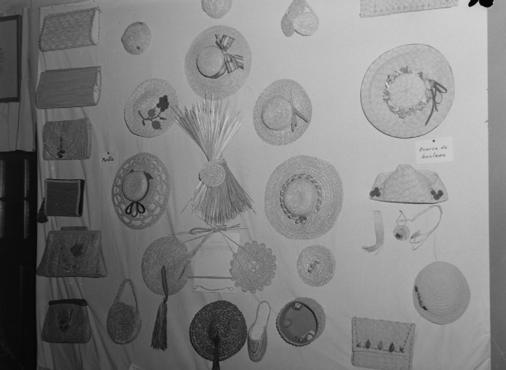 Nous voyons une exposition de sacs à main, de chapeaux et de paniers de paille présentée au Cercle Universitaire de Montréal