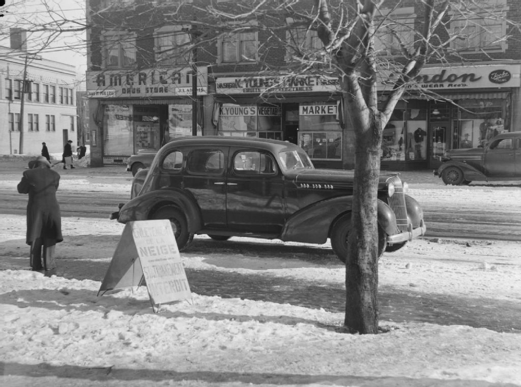 Une voiture est garée rue Sherbrooke Ouest à Montréal malgré un panneau interdisant de stationner à cet endroit afin de permettre l'enlèvement de la neige. Nous remarquons les commerces American Drug Store, K Young's Market et London Men's Wear Reg'd