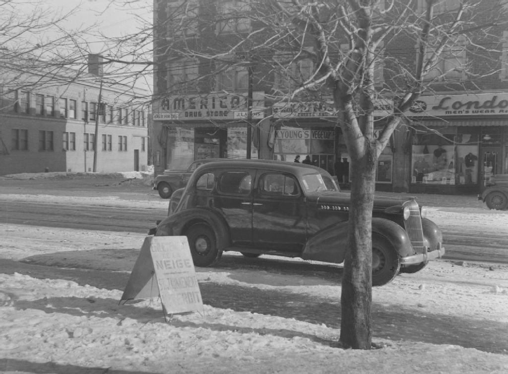 Une voiture est garée rue Sherbrooke Ouest à Montréal malgré un panneau interdisant de stationner à cet endroit afin de permettre l'enlèvement de la neige. Nous remarquons les commerces American Drug Store, K Young's Market et London Men's Wear Reg'd