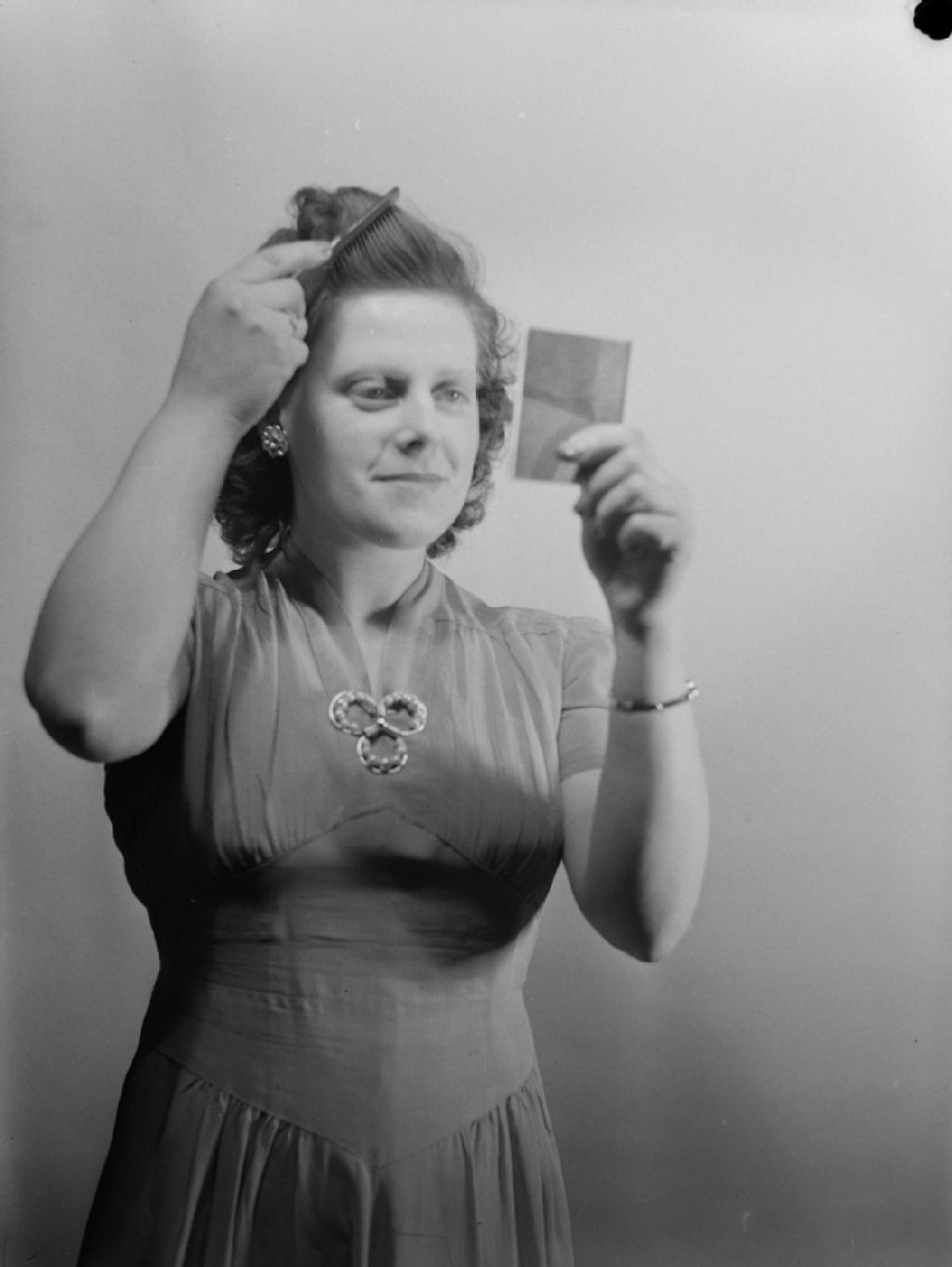 Fernande Lambert se peigne les cheveux en se regardant dans un petit miroir qu'elle tient devant son visage