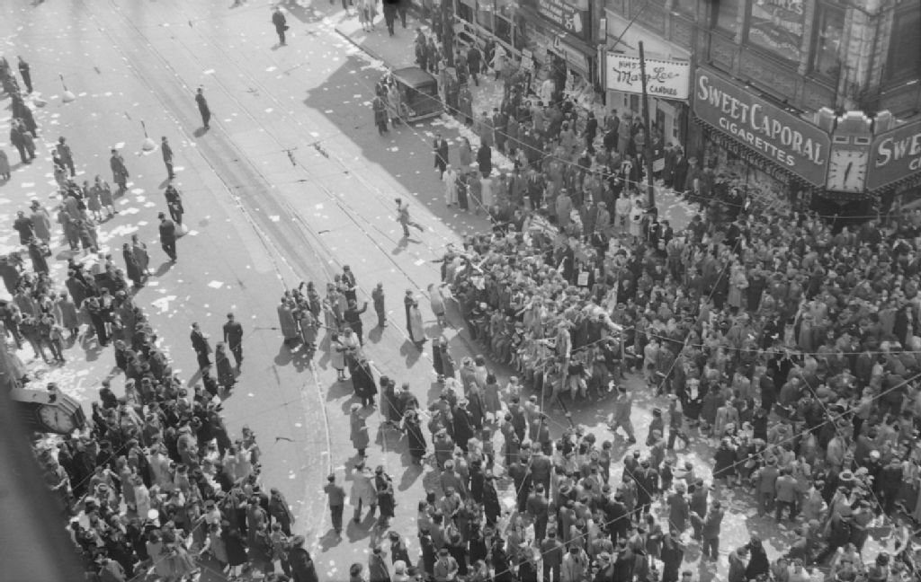 La foule célèbre le jour de la Victoire sur la rue Sainte-Catherine à Montréal. Cette manifestation populaire souligne la capitulation allemande et la fin imminente de la Deuxième Guerre mondiale