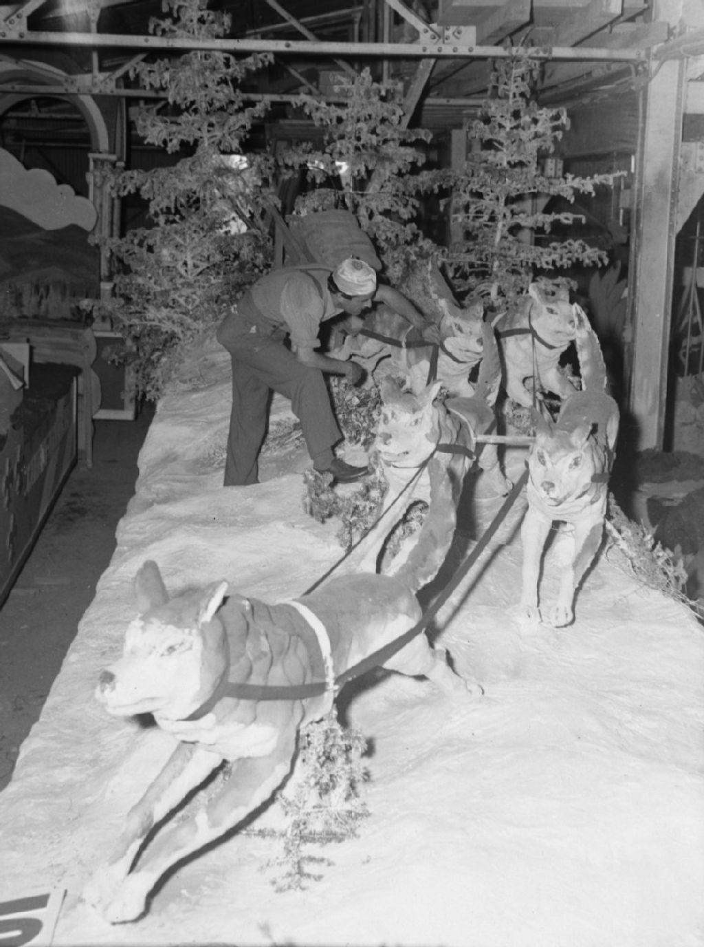 Un homme vérifie les harnais qui attachent les sculptures de chiens qui tirent le traîneau figurant sur un char allégorique du défilé de la Saint-Jean-Baptiste